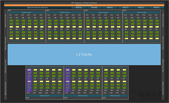 而RTX4080在完整的AD103核心的基础上做了些精简,阉割了2组GPC中的各2组SM单元,开启了76组SM单元,相比完整版AD103架构少了512个流处理器,为9728个CUDA核心,稍微缩减了Tencor Core和RT Core数量,搭载了完整的64MB二级缓存,相比RTX3090Ti的6MB提高了10倍还要多,二级缓存能够有效提升内部传输带宽,进而提升游戏性能。