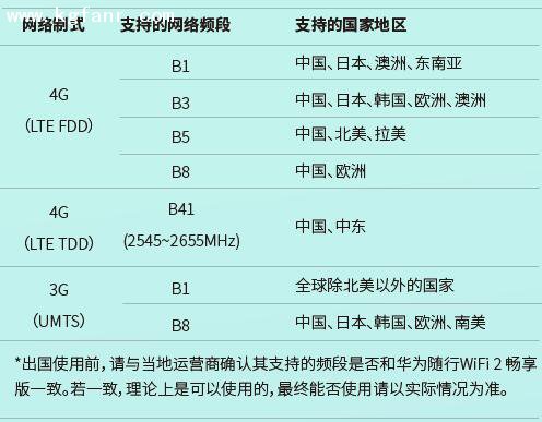 若使用国外运营商资费卡:参考如下表格确认当地网络是否支持华为随行WiFi的频段和制式。