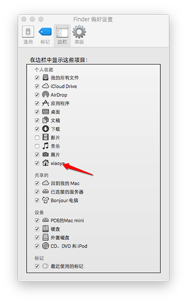 2)、打开“偏好设置”后,选择“边栏”,在小房子前面勾选上就可以了。