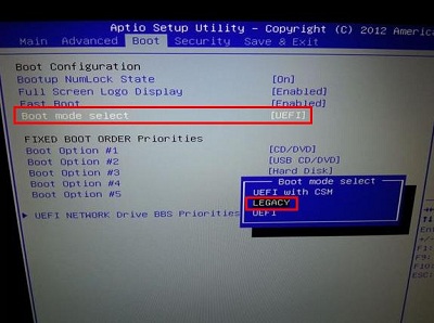 3、接下来,通过上下方向键将光标移至“Boot mode select”选项,按Enter键即可打开启动模式设置窗口,我们只需选择“legacy”,接着按Enter键确认即可,如下图所示: