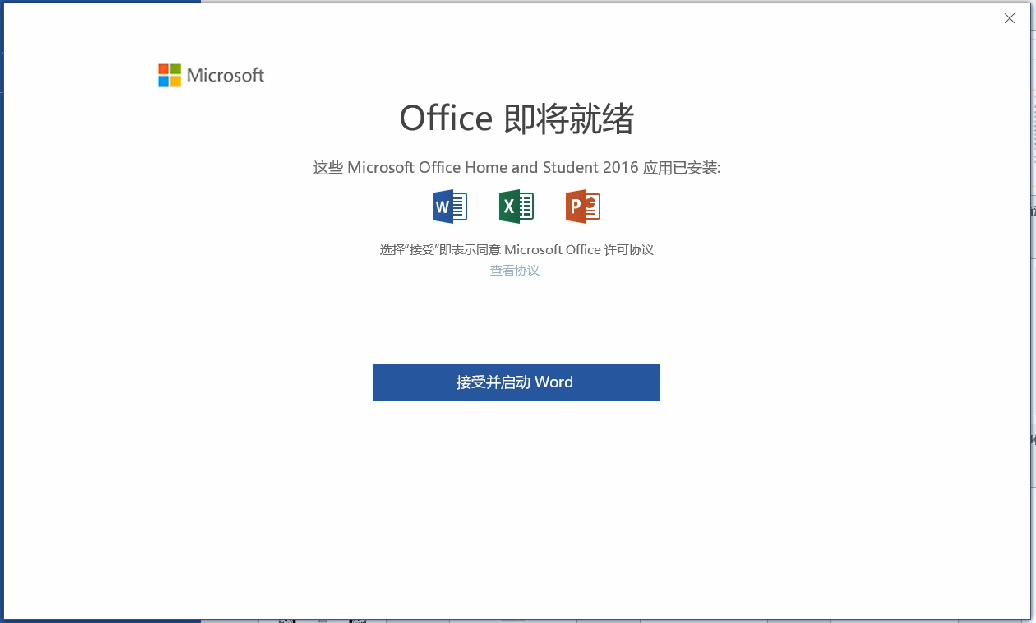 5. 稍等一段时间后会收到提示“Office即将就绪”,点击“接受并启动XXX”(如下图示例的是在 Word 中激活,点击“接受并启动Word”)。