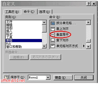 工具-自定义-命令-表格-将“垂直居中”拖到快捷工具栏“水平居中”旁边-关闭。