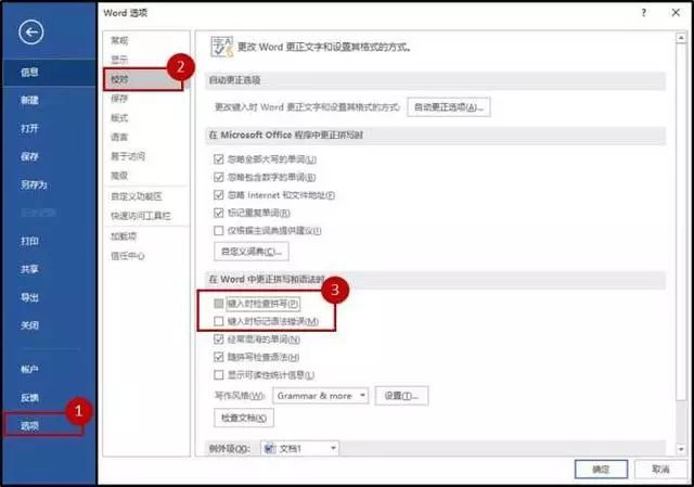 【文件】-【选项】-【校对】,取消勾选“键入时检查拼写”和“键入时标记语法错误”。