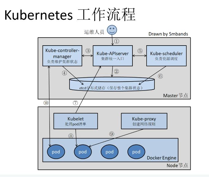 (4)Scheduler选择完节点后通过APIserver的Kubelet在对应的node节点上创建Pod,并通知对应node节点的doker在Pod中创建容器