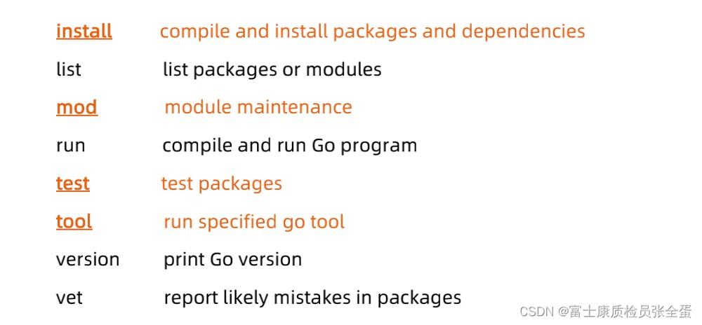build:从源代码构建成可执行文件get:下载一个包install:go install从github上面下载某一个包并且安装到本地,相当于是编译安装,所以很多时候开发一个go语言项目,上传到GitHub上面,你希望别人可以使用你的项目,如果go get会将源代码下载下来,如果是go install那么会将源代码下载下来,编译完成直接安装,接下来就可以直接使用。