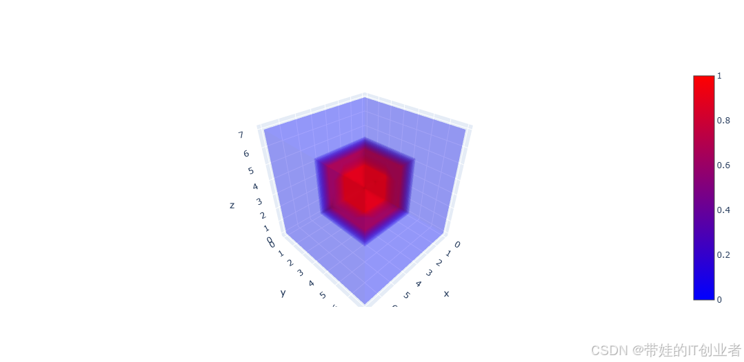 import plotly.graph_objects as go import numpy as np # 创建 3D 体素数据 x, y, z = np.indices((8, 8, 8)) cube1 = (x < 3) & (y < 3) & (z < 3) cube2 = (x >= 5) & (y >= 5) & (z >= 5) voxelarray = cube1 | cube2 colors = np.empty(voxelarray.shape, dtype=object) colors[cube1] = 'blue' colors[cube2] = 'red' # 绘制 3D 体素图 fig = go.Figure(data=go.Volume( x=x.flatten(), y=y.flatten(), z=z.flatten(), value=voxelarray.flatten(), colorscale=["blue", "red"], opacity=0.2, surface_count=17 )) fig.show()