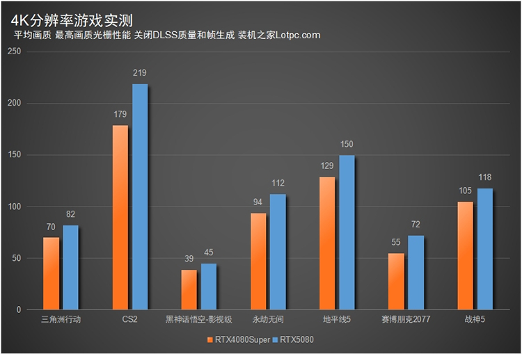 对于RTX50系列次旗舰级的RTX5080显卡来说,游戏测试环节就不考虑1080P和2K下的测试,而是直接上4K分辨率进行测试。游戏分别测试了《三角洲行动》、《CS2》、《黑神话悟空》、《永劫无间》、《地平线5》、《赛博朋克2077》、以及《战神5》游戏,设置在4K最高画质,关闭DLSS质量+帧生成以及光追,只测试传统的光栅性能,仅供参考。