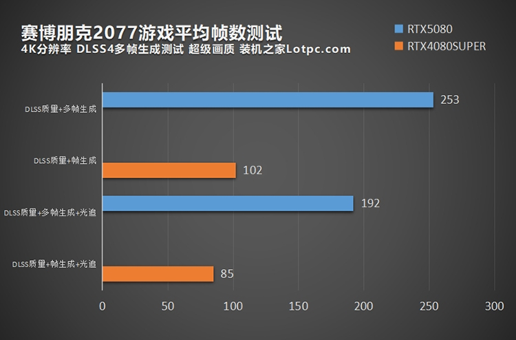 能够看到,RTX5080开启了DLSS4多帧生成后,相比RTX4080Super的DLSS3帧生成,实现了性能翻倍,可见DLSS4的威力还是相当巨大的。