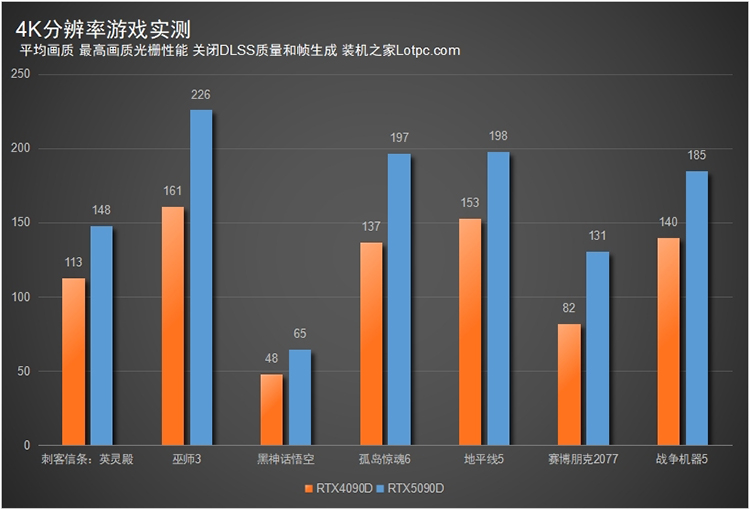 4K分辨率最高画质下,RTX5090D相比RTX4090D在这几款游戏测试中,综合游戏性能领先了37.8%。