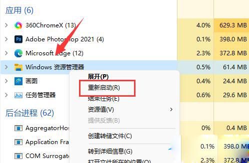 2. 打开后,右键“Windows资源管理器”,点击“重新启动”即可。