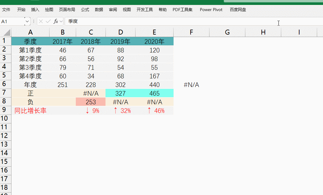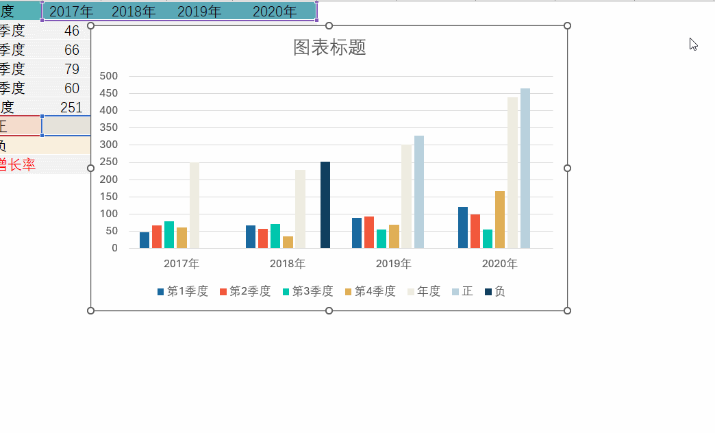 把四个季度数据设置为次坐标,然后把正和负修改为折线图
