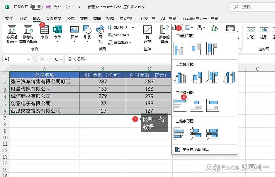 首先我们需要做一个辅助列,将数值复制一份,放在旁边,之后点击图表,来插入【条形图即可】