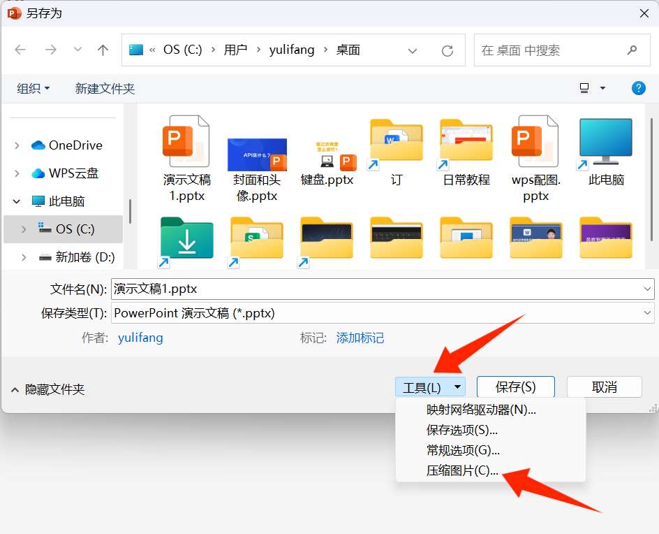 4、在【另存为】对话框下方点击【工具】选项卡,在下拉菜单中选择【压缩图片】。(图片通常也是PPT体积大的重要原因)