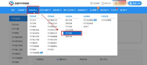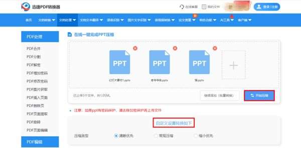 上传需要压缩的PPT文档,设置压缩类型,网站支持清晰优先、常规压缩和缩小优先,选择一个需要的压缩模式,然后点击【开始压缩】。