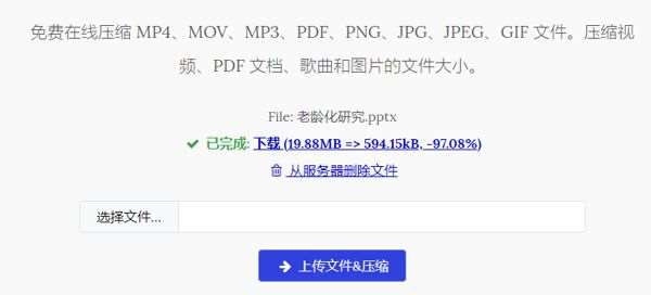 点击【上传文件&压缩】开始处理压缩PPT大小,在页面内我们可以直接看到压缩率以及压缩后的大小,需要手动保存压缩后的文件。