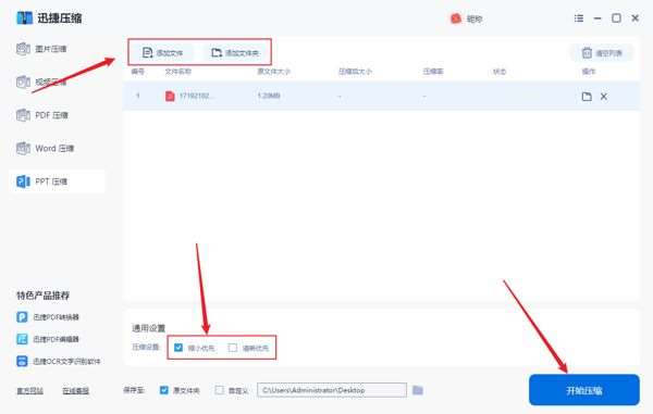 缩小优先和清晰优先两种压缩模式可以选择,追求将PPT体积变小的小伙伴可以使用缩小优先模式,设置存储目录点击【开始压缩】即可。