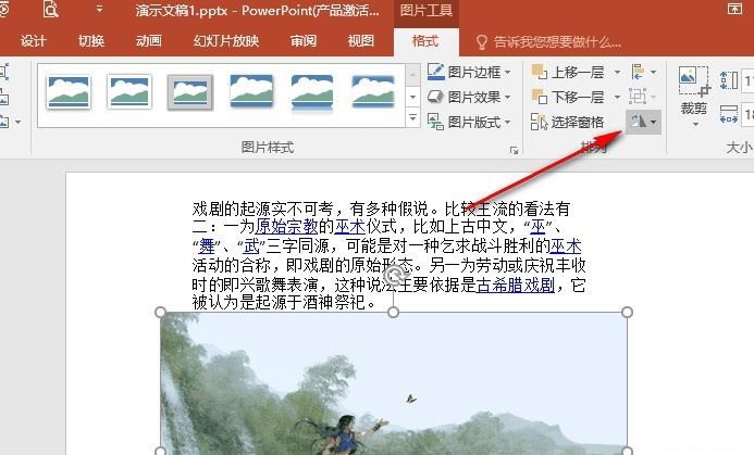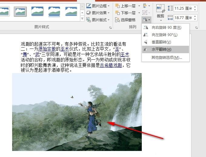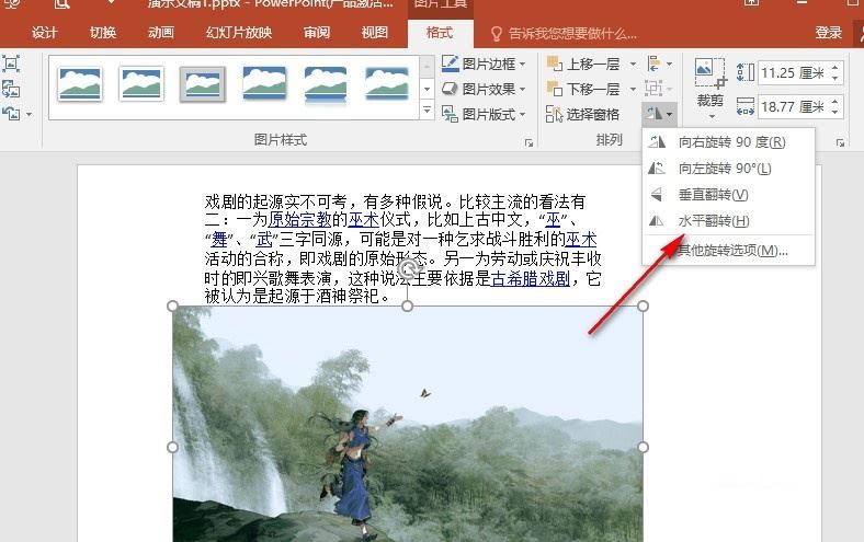 5、点击“水平翻转”选项之后,我们在幻灯片中就能看到图片画面已经完成镜像翻转了