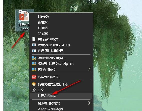1、我们右键单击演示文稿,然后在菜单列表中点击“打开方式”选项,再在弹框中选择powerpoint选项