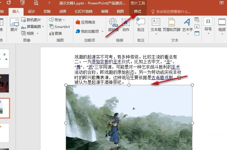2、打开演示文稿之后,我们再在幻灯片中选中需要设置的图片,然后打开“格式”工具