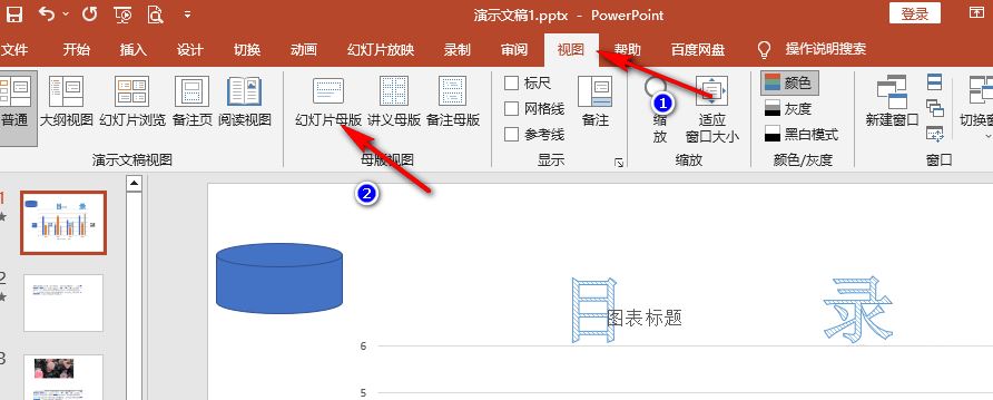 2、进入PPT页面之后,我们在“视图”的子工具栏中点击打开“幻灯片母版”工具