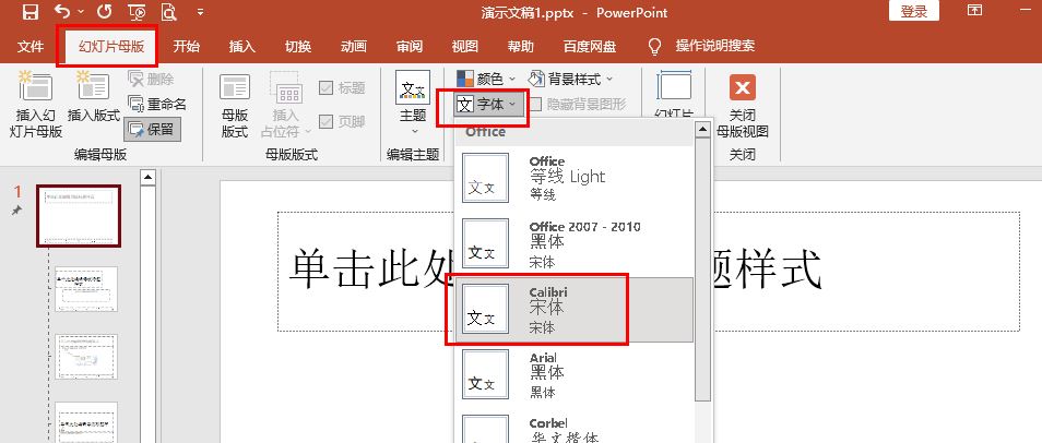 3、在幻灯片母版页面中,我们先点击第一也幻灯片,然后在工具栏中打开“字体”工具