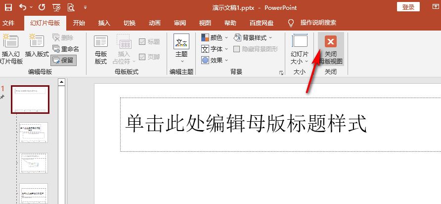 5、设置完成之后,我们点击“关闭母版视图”选项,然后就能看到幻灯片中的字体都变为宋体了