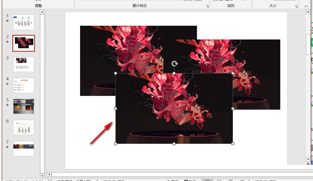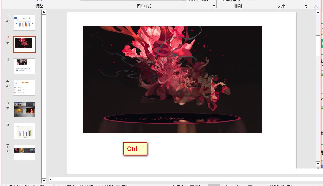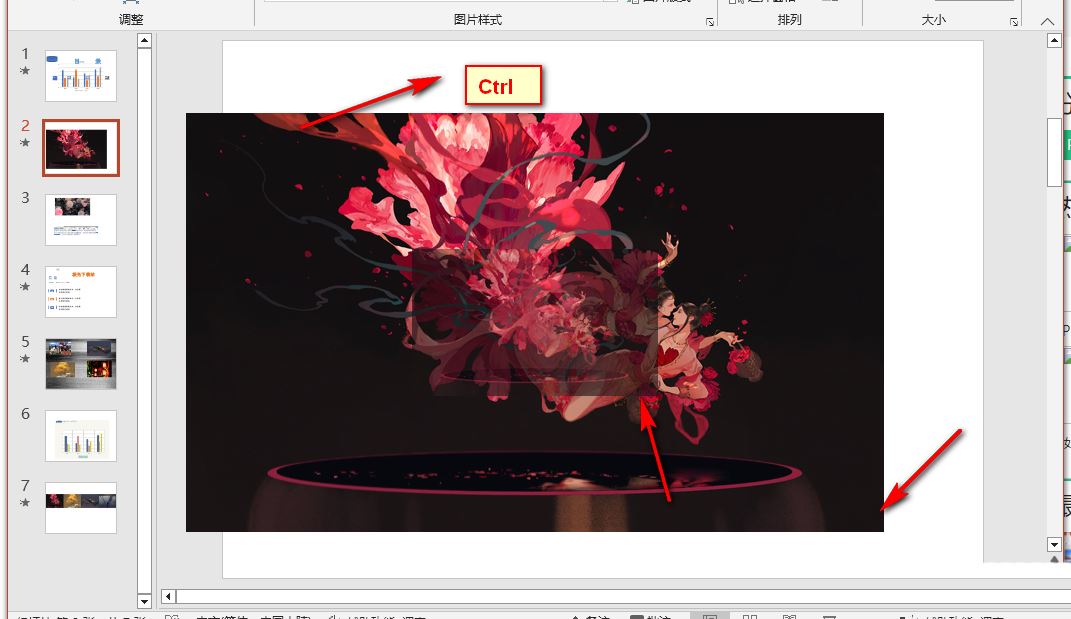 以上就是PPT进行中心等比缩放的方法,我们在PPT中插入自己准备好的图片,然后在幻灯片中先点击图片,然后按住“Ctrl”键,接着拖动图片四个角中的任意一角就可以进行中心等比缩放了,希望大家喜欢。