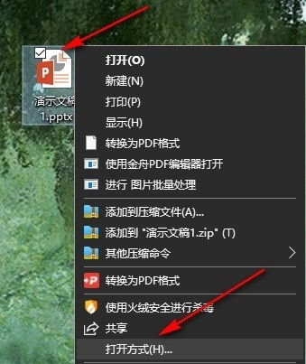1、第一步,我们找到需要编辑的演示文稿,右键单击该演示文稿,然后先点击“打开方式”选项,再点击选择“PowerPoint”选项