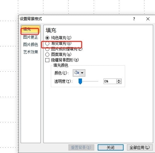 3、进入到设置背景格式窗口中,用户在填充选项卡中勾选渐变填充选项