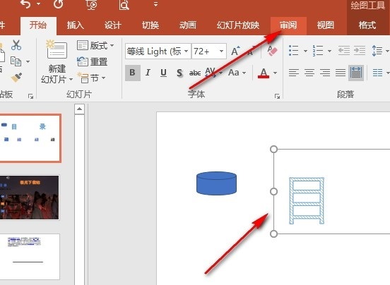 2、第二步,进入PPT页面之后,我们在该页面中选中需要翻译的文字,然后在工具栏中打开“审阅”工具