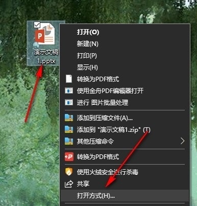 1、第一步,我们先右键单击一个演示文稿,然后在菜单列表中找到“打开方式”选项,点击该选项,再点击选择powerpoint选项