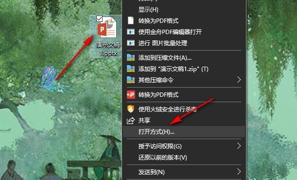 1、第一步,我们右键单击需要编辑的演示文稿,然后在菜单列表中找到“打开方式”选项,点击该选项,再点击powerpoint选项