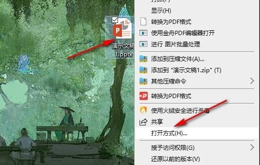 1、第一步,我们在电脑桌面找到自己需要的编辑的演示文稿,直接双击打开该幻灯片或是右键单击选择“打开”选项