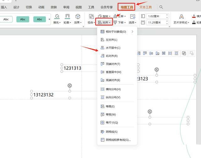 如果选中文本框后,未出现这一排对齐图标,我们也可以点击标题栏中的“绘图工具”,在里面找到“对齐”功能,并在下拉菜单中选择需要的对齐方式,如下图: