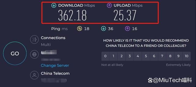 点击“GO”或“开始测速”按钮,即可开始测速。