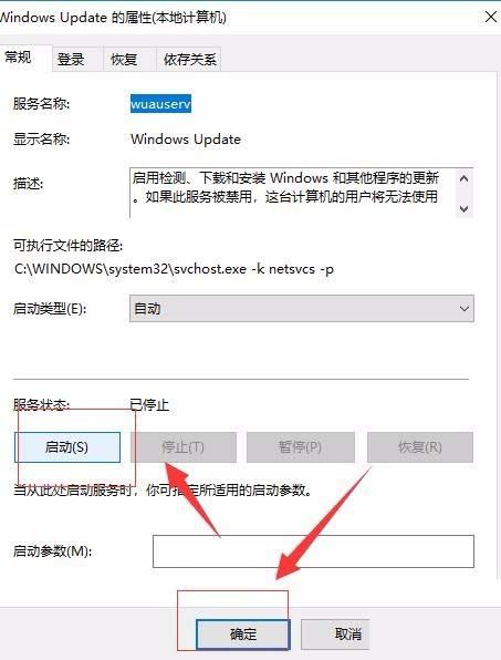 然后,在Windows Update属性窗口中,点击“启动”按钮 ,启动Windows UPdate服务。然后,点击“确定”退出。如图:
