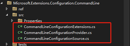 实现自定义配置提供程序,其实只需要实现三个类就可以,一个是配置源、一个是配置提供程序、一个是针对当前配置的扩展方法。第三个类可有可无,不过我们一般都要实现。我们来参考下基于命令行的配置提供程序类库的文件。