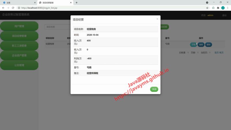 登录、注册、退出、用户模块、公告模块、职工工资模块、企业资产模块、项目经营模块的增删改查管理