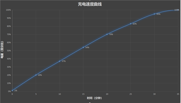 我们在室温25度的环境下,电量剩余1%,开启急速充电模式测试有线充电速度,每5分钟采集一次充电数据。