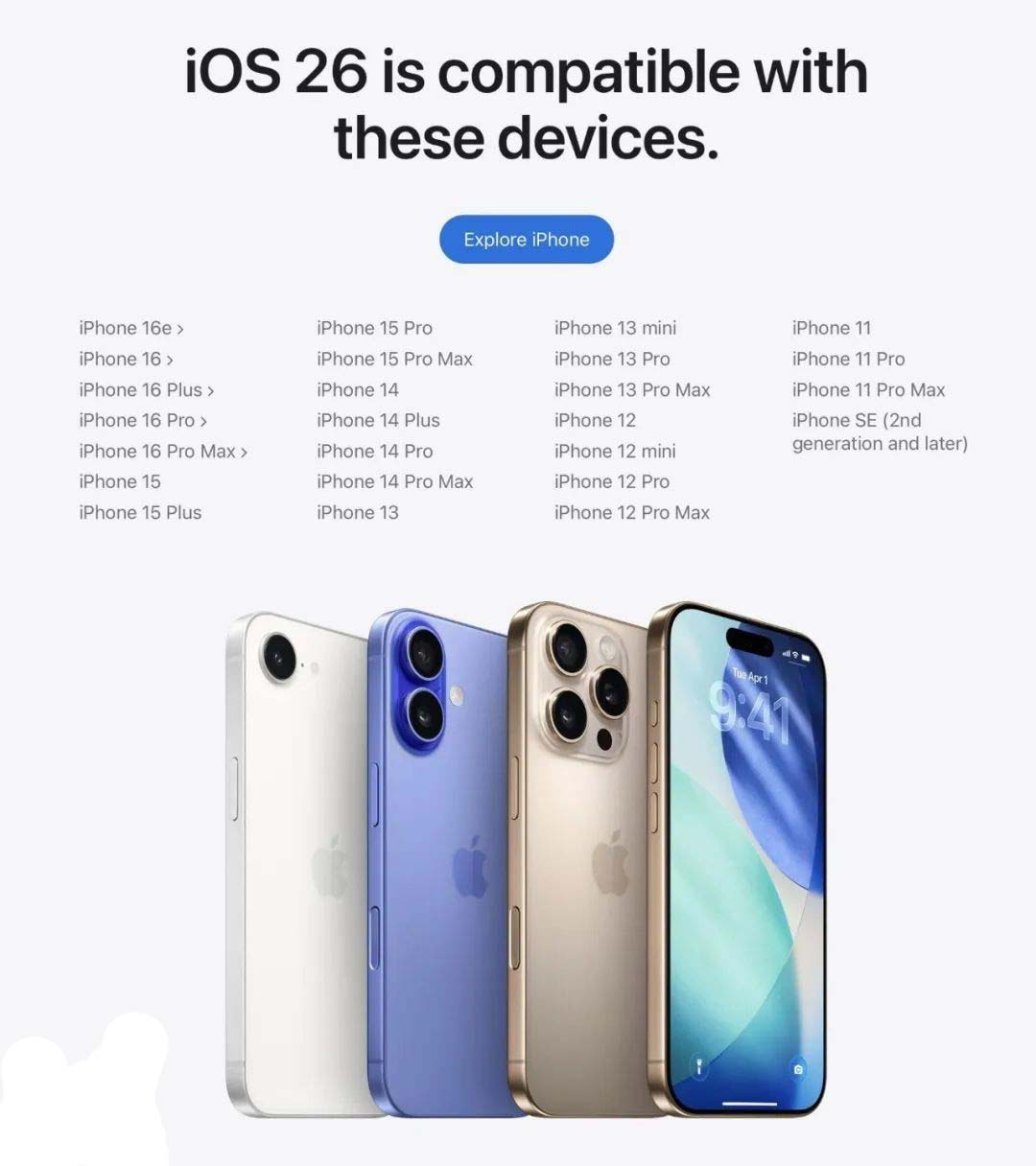支持升级 iOS 26 的机型名单如下: