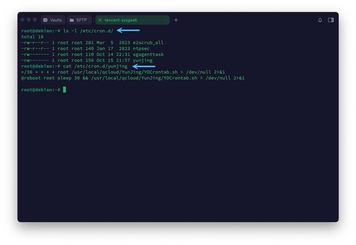 举个例子,腾讯云的「服务器安全监控组件」的定时任务就定义在/etc/cron.d/yunjing文件中。这个文件定义了两个任务: