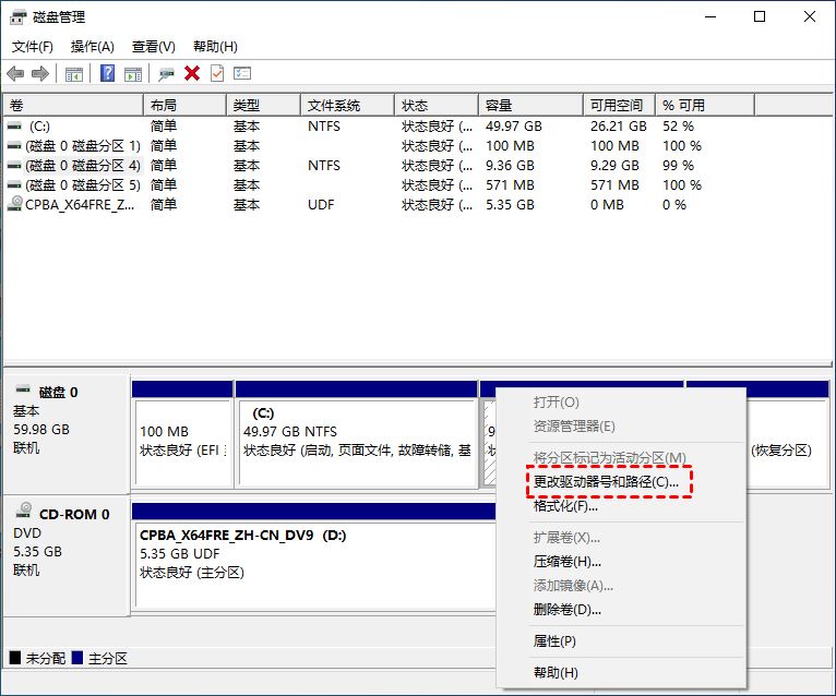2. 进入磁盘管理后,右键单击没有盘符的分区选择“更改驱动器号和路径”。