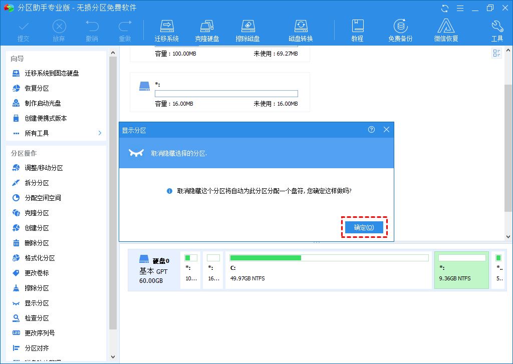 电脑硬盘突然只剩C盘,可能是因你的一些误操作将分区隐藏了,所以无法在文件资源管理器中显示。你可以借助磁盘分区管理工具——傲梅分区助手,将隐藏的分区显示出来。具体操作步骤如下: