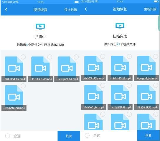 选择之后,系统会进入自动扫描的页面,等待片刻之后就可以看到被删除的视频、音频信息了,选择需要恢复的,确认恢复就可以啦。