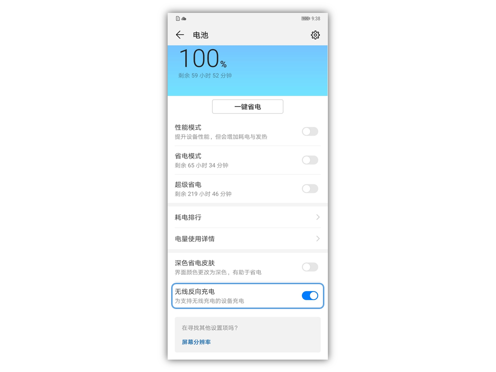 1. 在 设置 > 电池 选项菜单内,打开无线反向充电的功能开关,如下图所示: