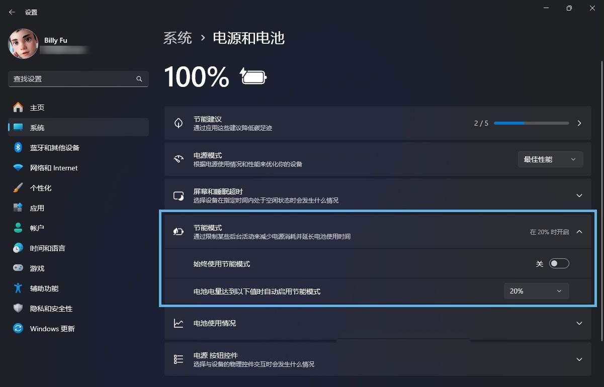 「节能模式」提供了更多的控制项,而且可以随时开启,在接通电源时也不例外。它会将屏幕亮度降低 30%,阻止大多数后台应用运行,并禁用窗口的透明效果。