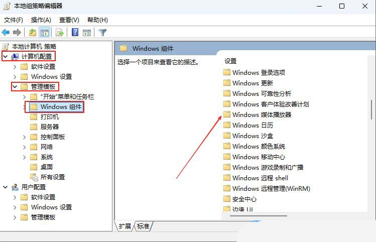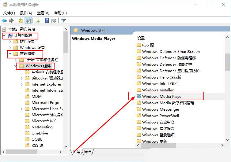 2、本地组策略编辑器窗口中,依次展开到:计算机配置 - 管理模板 - Windows 组件,然后在右侧窗口中找到 Windows Media Player 选项,选中并双击打开;