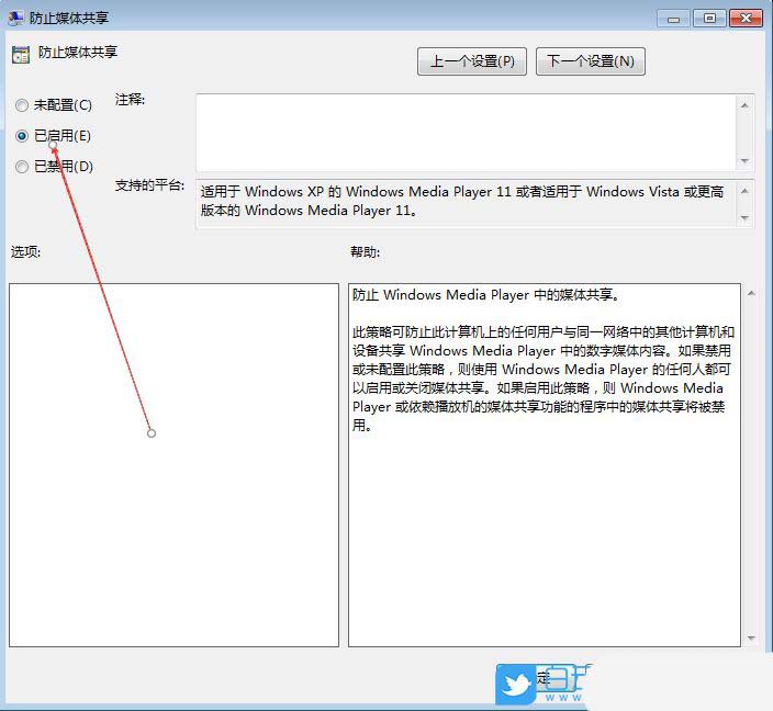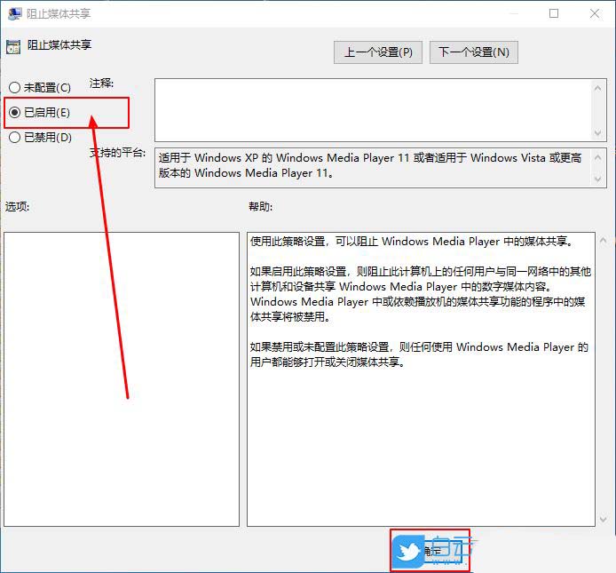 4、阻止媒体共享窗口中,将其设置更改选择为已启用选项,然后点击确定即可;
