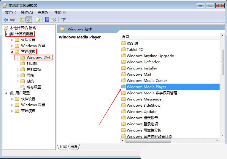 2、接着,依次点击展开“计算机配置 - 管理模板 - Windows 组件-Windows Media Player”;