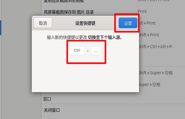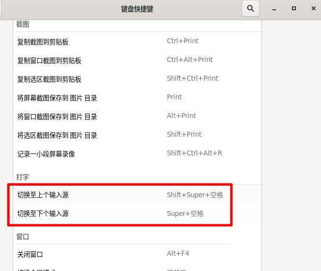 默认切换到下一个输入法的快捷键为【Super+空格】,切换到上一个输入法的快捷键为【Shift+Super+空格】。两个可以同时修改,修改方法一样,首先单击快捷键。